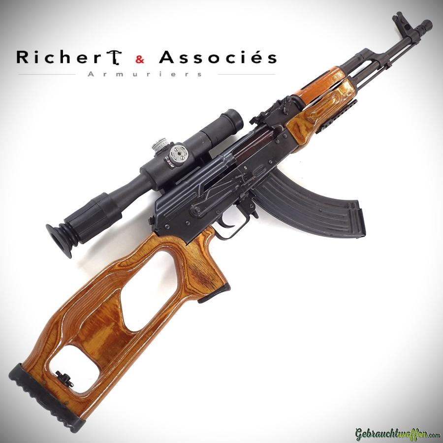 Fusil Kalashnikov mod. AK-47, cal. 7.62x39, semi-automatique d'origine, équipé d'origine avec une crosse genre Dragunov, en très bon état, livré avec une lunette et un magasin de 20 coups. Un PAA est suffisant si livré avec un chargeur de 10 coups.