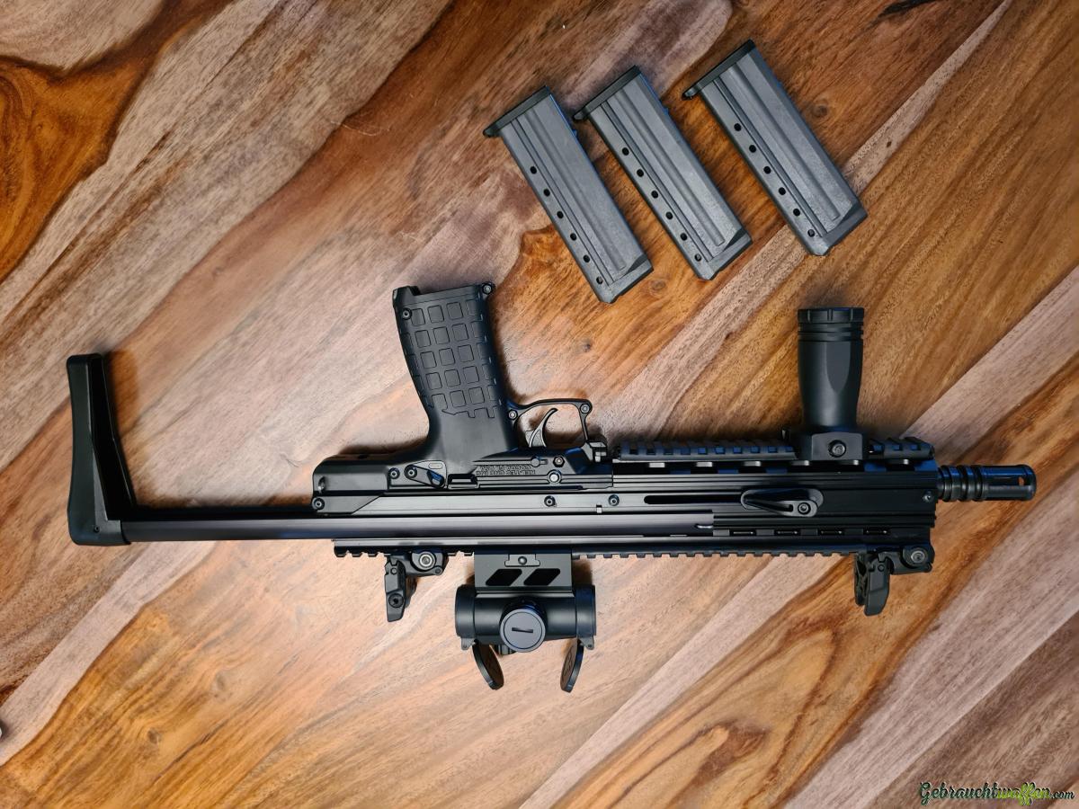 Keltec CMR30 " MP7 at home" .22 Magnum in wunderbarem Zustand ink. Magpul Notvisier, Rotpunktvisier, 3x30 Schuss Magazine, mündungsfeuerdämpfer, vertikal Griff... der Lauf wurde von der Original Länge von 16 Zoll vom Büchsenmacher von Waffen Ingold gekürzt und ein 1/2×20 Gewinde geschnitten für die Montage von Mündungsaufsätze / Schalldämpfer so wie die Rückstoss Feder angepasst für eine Zuverlässige Funktion mit und ohne Schalldämpfer mit CCI .22 Magnum Munition mit ABK Sammler weil unter 60cm kürzbar: 900.-