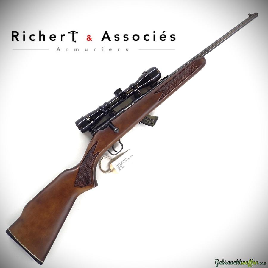 Carabine à verrou Lakefield mod. Mark II, cal. 22LR, chargeur de 10 coups, crosse en bois avec quadrillage, hausse réglable en hauteur, en très bon état, livrée avec une lunette.
