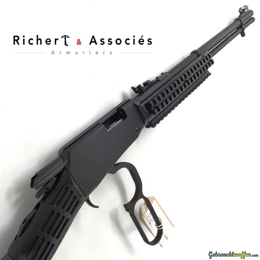 Carabine à levier de sous-garde Mossberg, mod. 464SPX, cal .22LR, finition noire matte, en excellent état. Il s'agit d'une version "tacticool" du modèle 464 standard, avec une crosse télescopique en polymères et 3 rails picatinny sur le garde-main.