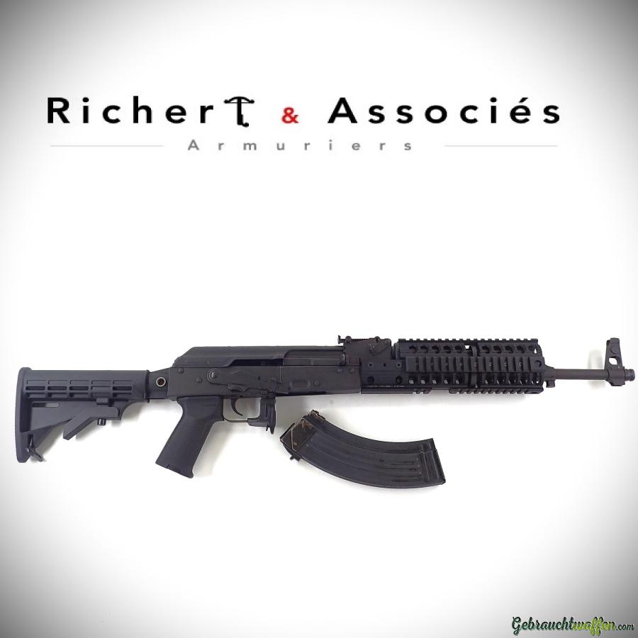 Fusil Pioneer Arms mod. AK47, cal. 7.62x39, canon de 14 pouces (36cm), semi-automatique d'origine, équipé d'un garde-main en alu avec 4 rails picatinny et d'une crosse télescopique, en très bon état, livré avec un chargeur de 30 coups. Acquisition avec PAA simple si livré avec un chargeur de 10 coups.