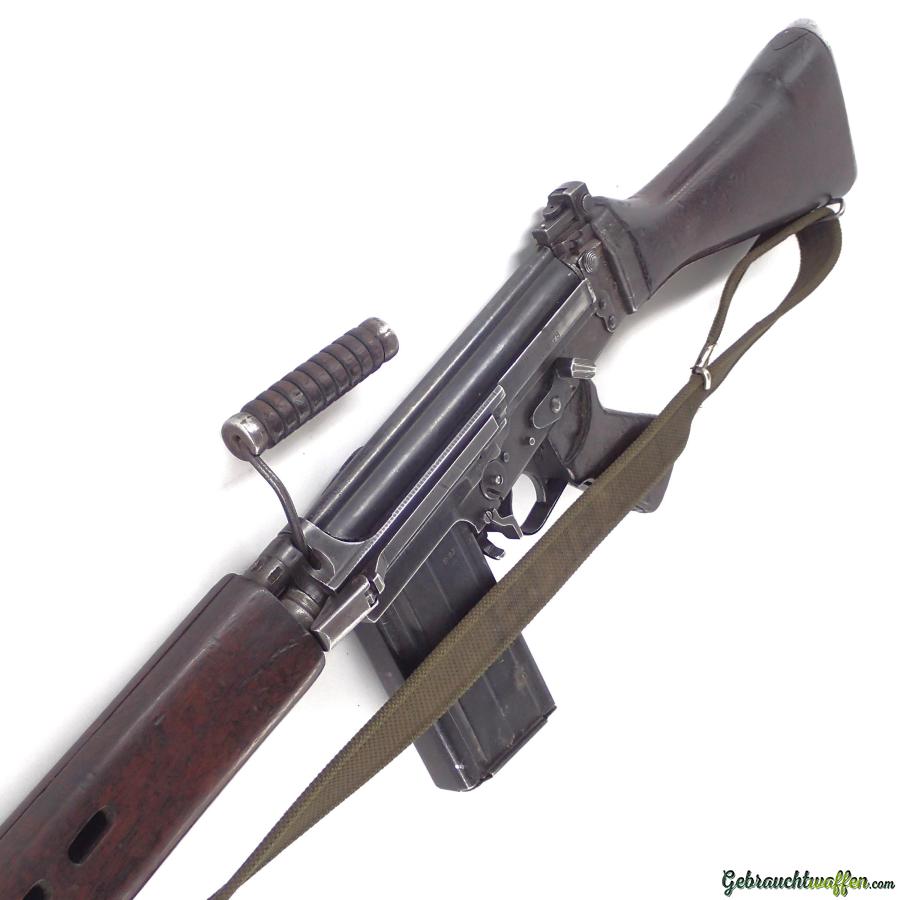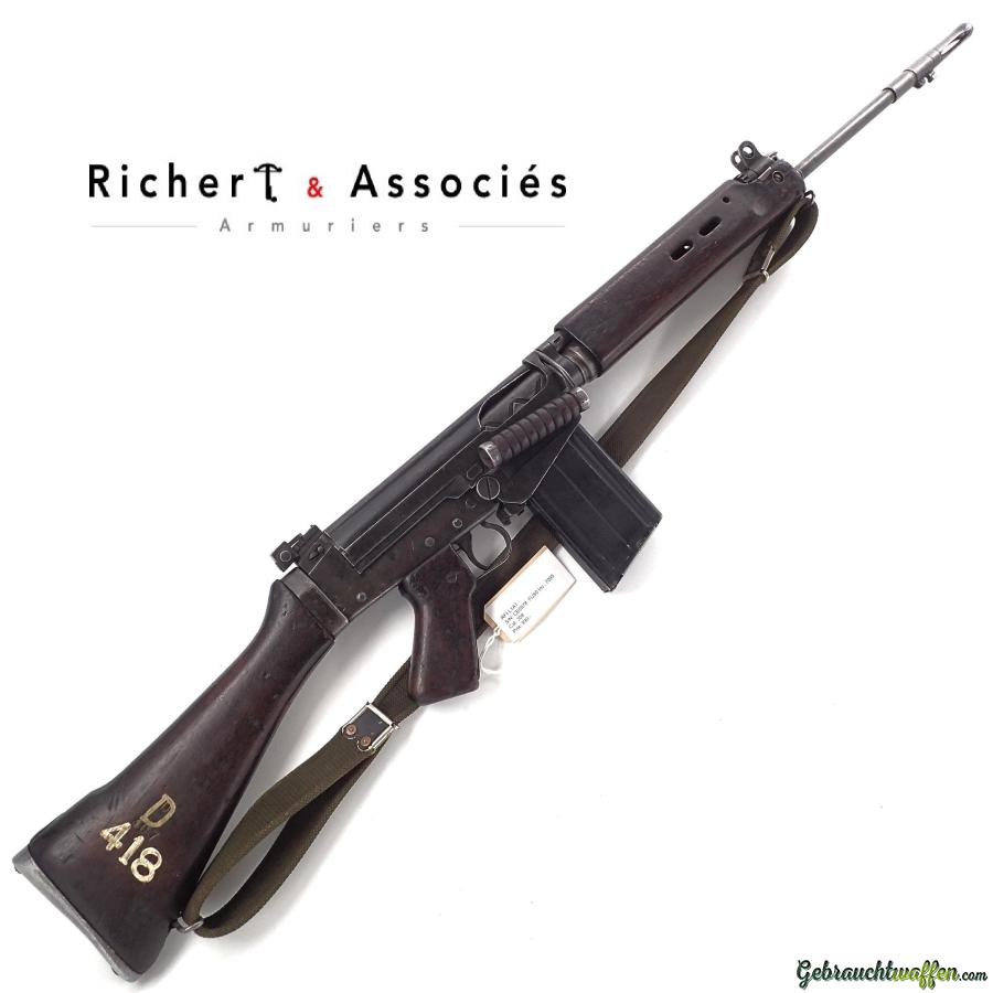 RFI FAL-Gewehr, Modell L1A1, Kal. 308Win (oder 7.62x51NATO), mit Schaft, Griff und Handschutz aus Holz, originale halbautomatische Version, mit 10-Schuss-Magazin, in gutem Zustand. Für Magazine mit mehr als 10 Schuss ist eine Ausnahmebewilligung für Schützen (ABS) erforderlich.
