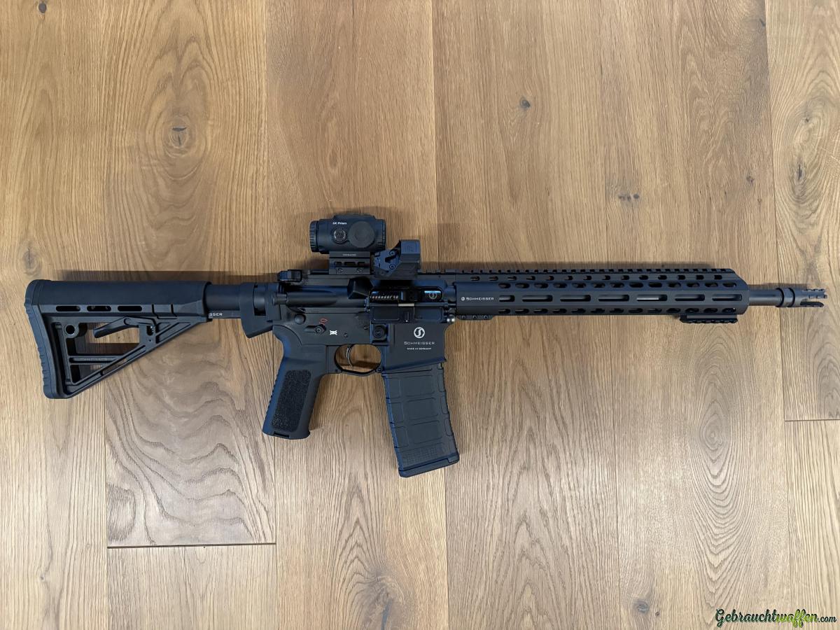 Schmeisser AR15 M4FL im Kaliber .223 mit Lauflänge 14.5". Es wurden keine 500 Schuss damit geschossen (keine Kratzer, funktioniert einwandfrei). Neuste Generation mit geradem Griff.