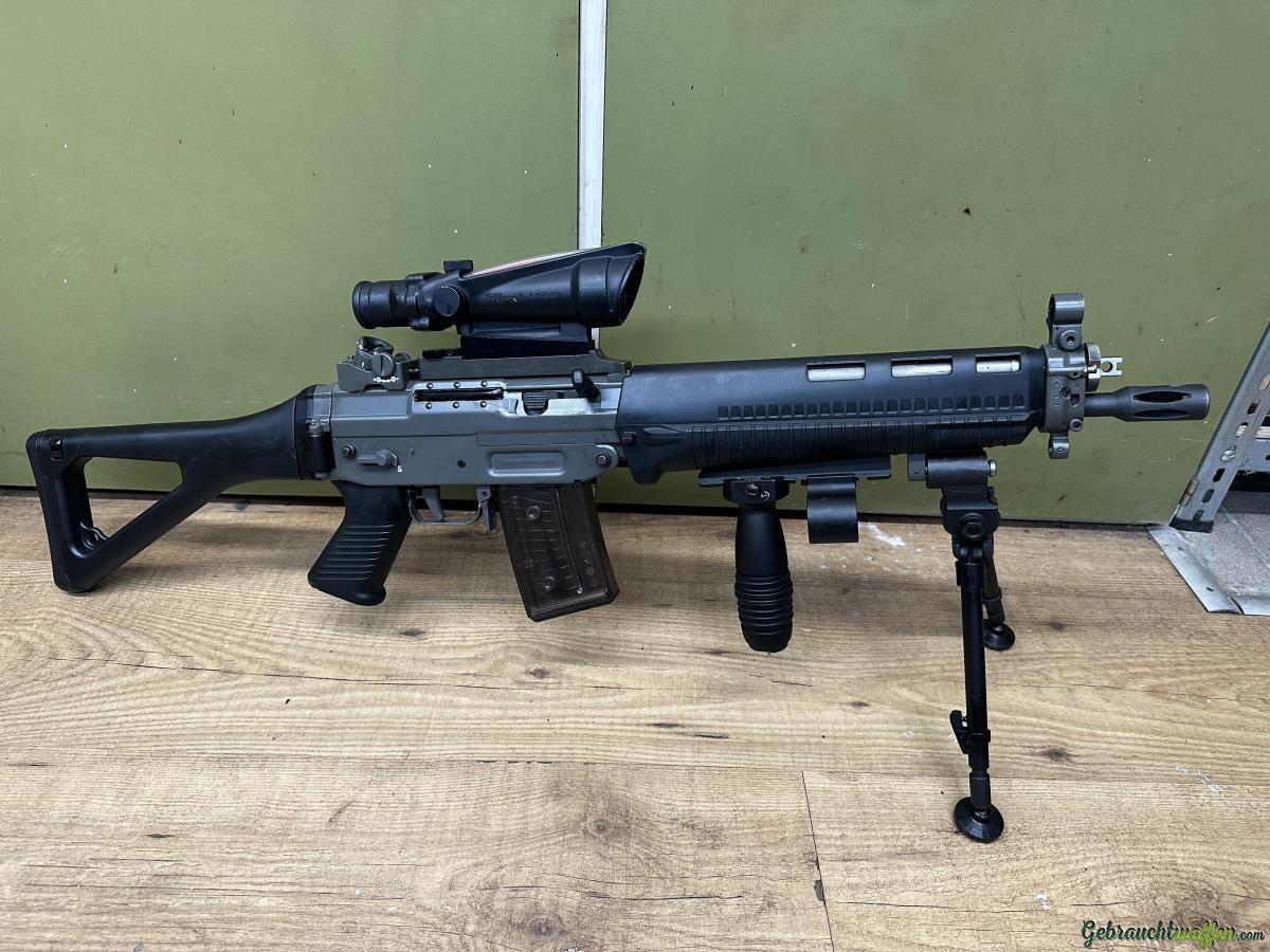 Zum Verkauf steht ein schwarzes SIG 551 SWAT im Kaliber 5.56 NATO in sehr gutem Zustand. Die Waffe wurde nur wenig genutzt, stets sorgfältig gepflegt und weist lediglich leichte Gebrauchsspuren auf.
