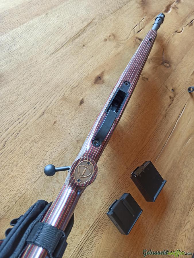 Schwerer 16.5" Matchlauf mit 5/8x24 Gewinde. Sehr effektive Mündungsbremse Deserttech SRS-A2 Aftershock. Verstellbarer Druckpunktabzug. Lange Picatinnyrail. AICS-kompatible Magazine 5- und 10-Schuss. Gesamtlänge ca. 93 cm.
