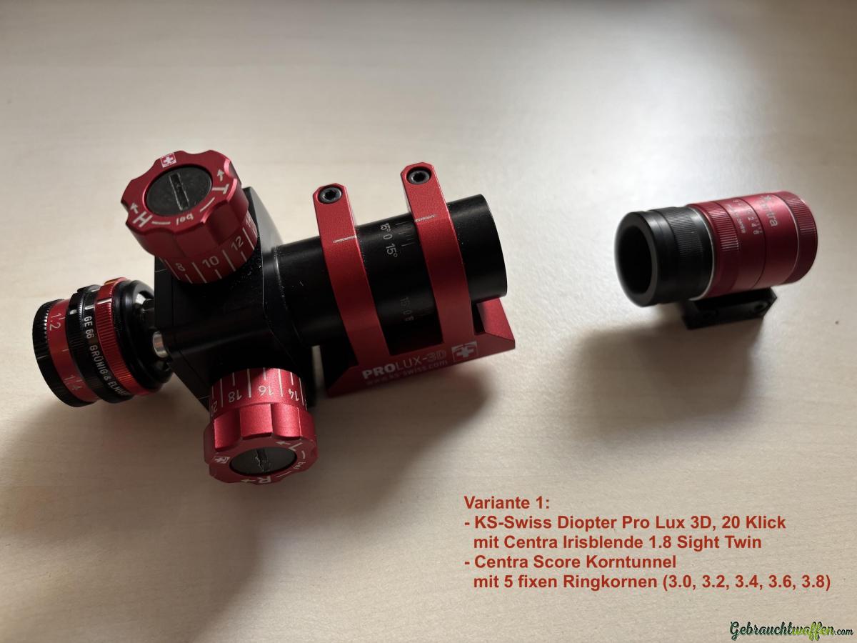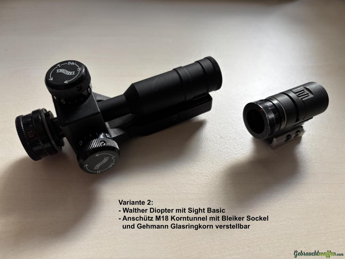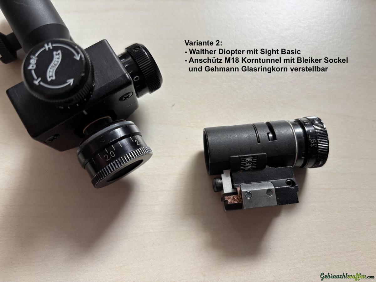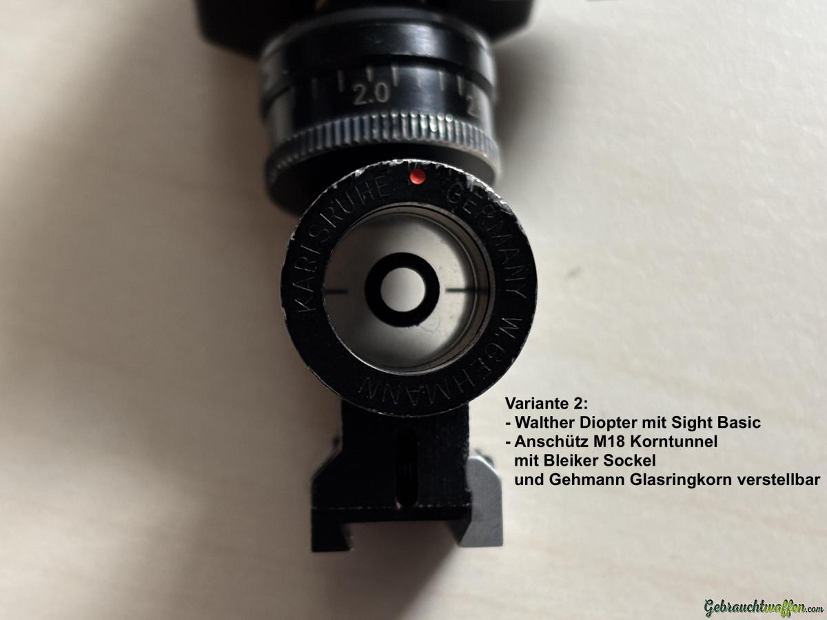 Auf Wunsch kann das Gewehr auch in Variante 2 mit "einfacherer Visierung" gekauft werden. Dies wäre mit Walther 20 Klick Diopter und Sight Basic sowie M18 Korntunnel und Gehmann Iris-Ringkorn. Der Preis für das Gewehr in Konfigurationsvariante 2 wäre dann 1'500.- CHF.