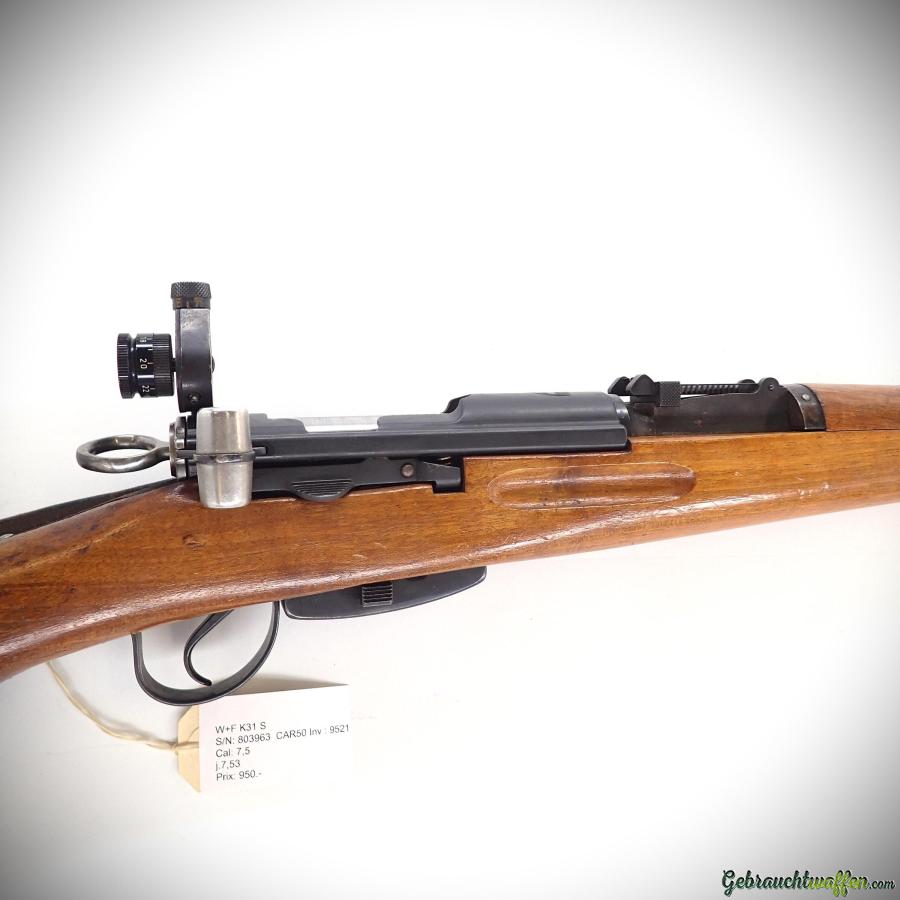 W+F-Karabiner Modell K31, Kaliber 7,5 mm, mit Hämmerli-Lauf (7,53 mm), Dioptervisier mit Irisblende auf linksseitiger Schwalbenschwanzführung, langer, am Lauf angeschweißter Tunnel, Baujahr 1944, sehr guter Zustand.