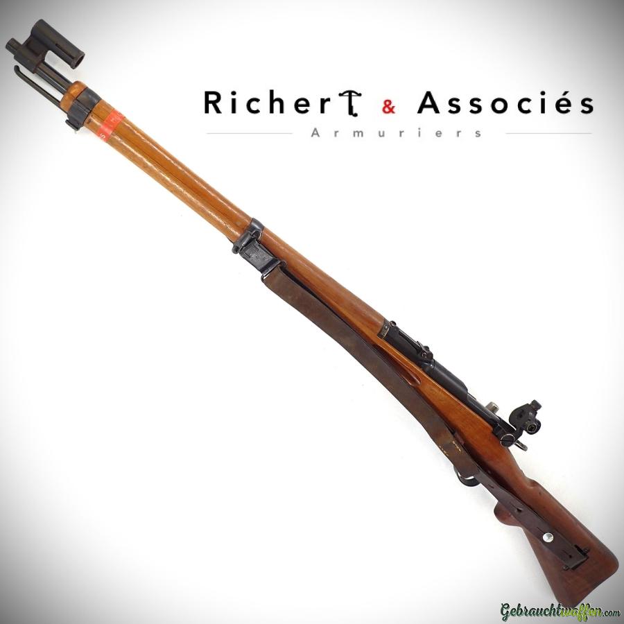 Mousqueton W+F mod. K31, cal. 7.5, à canon Hämmerli jaugé à 7.53, dioptre avec iris sur queue d’aronde à gauche, tunnel long soudé au canon, fabriqué en 1944, en très bon état.