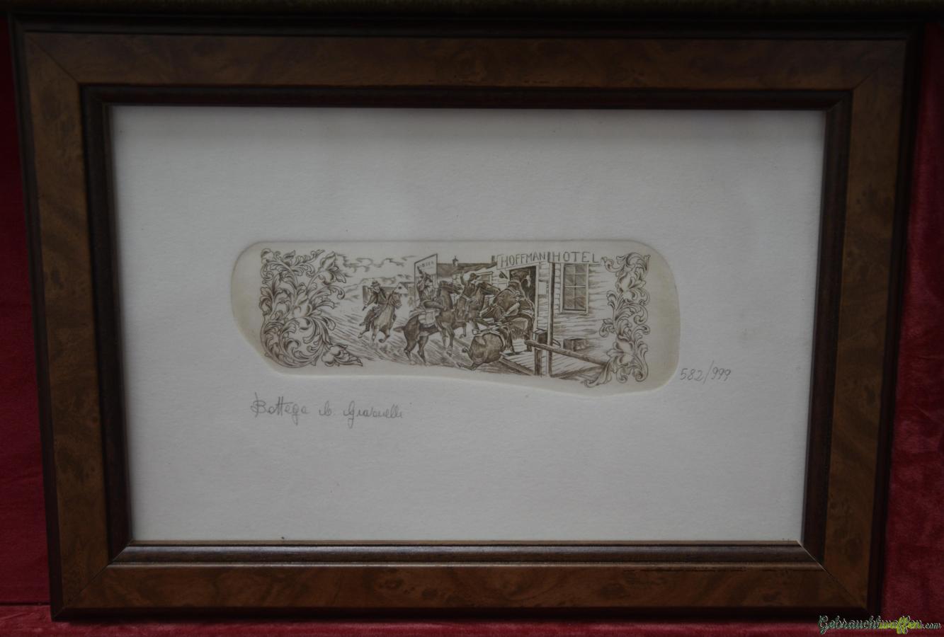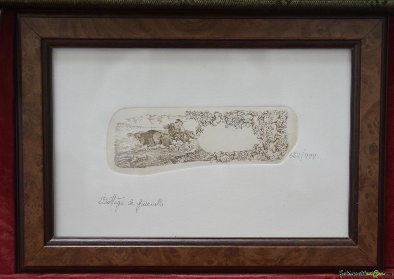 Die Waffe wird komplett mit Originalkoffer und zwei Bildchen verkauft, die die Gravur des Gewehrs zeigen (in diesem Fall hat einer die Nummer 582, der andere 682) vom selben Graveur angefertigt wurden.