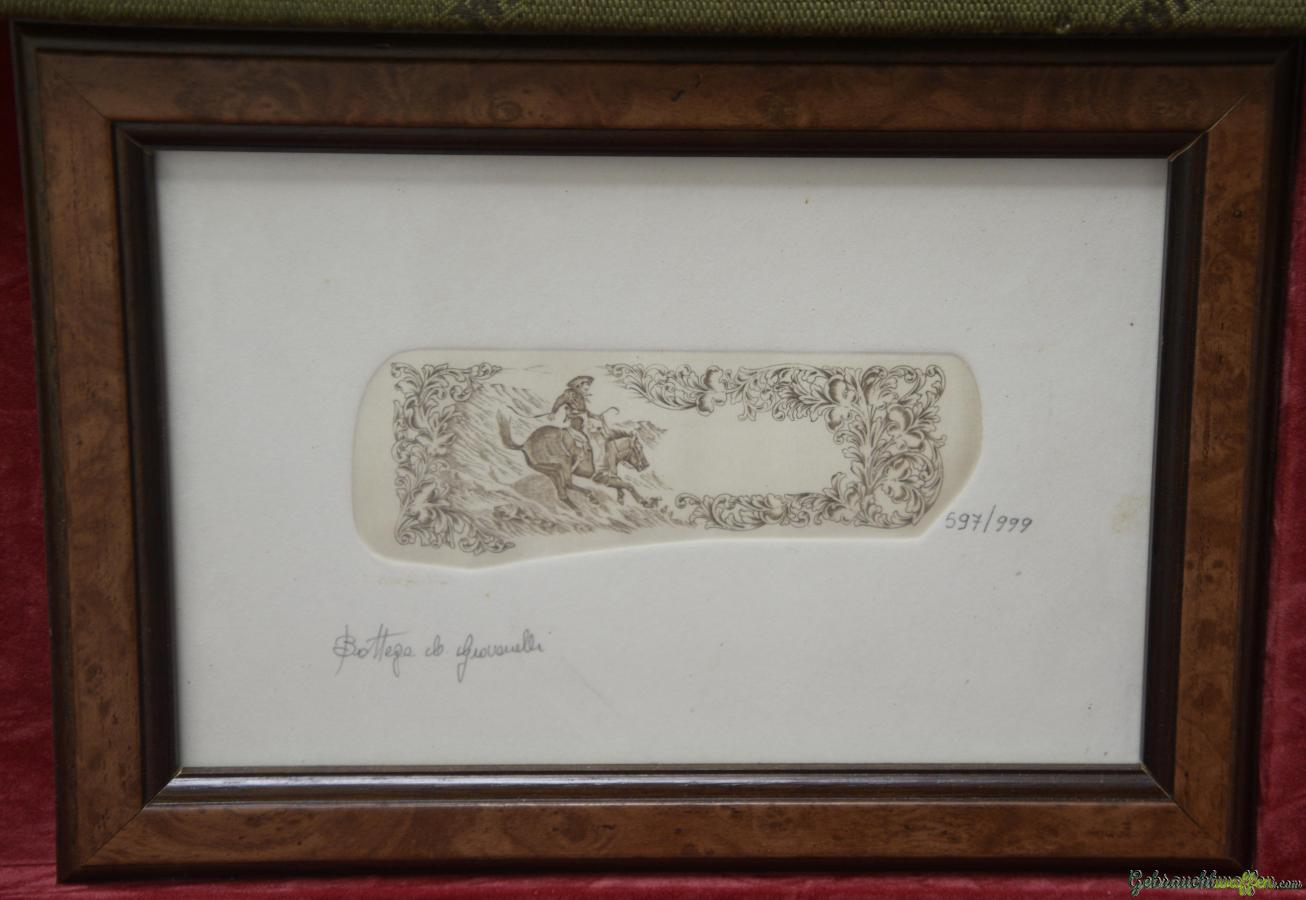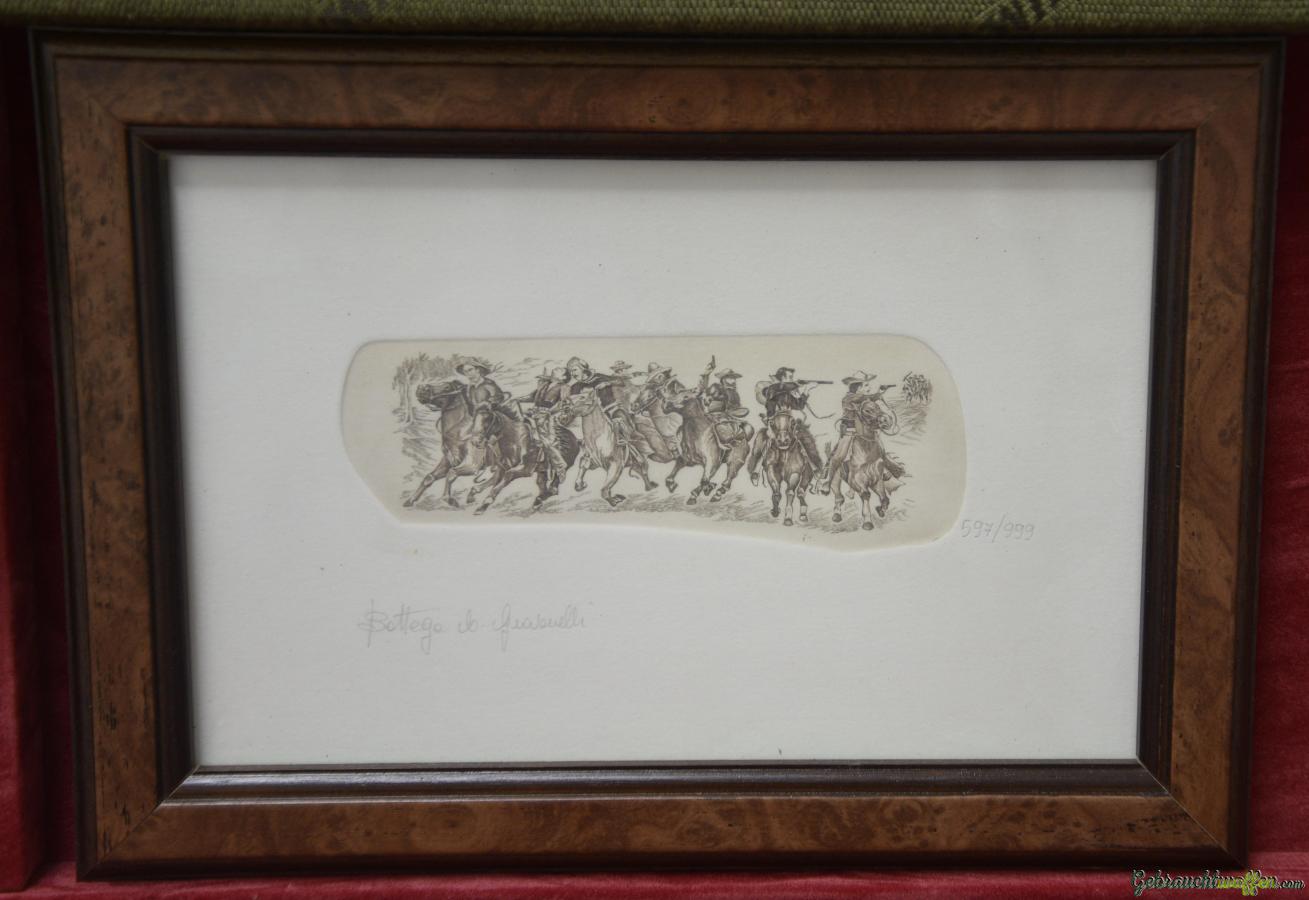 Die Waffe wird komplett mit Originalkoffer und zwei Bildchen verkauft, die die Gravur des Gewehrs zeigen und vom selben Graveur angefertigt wurden.