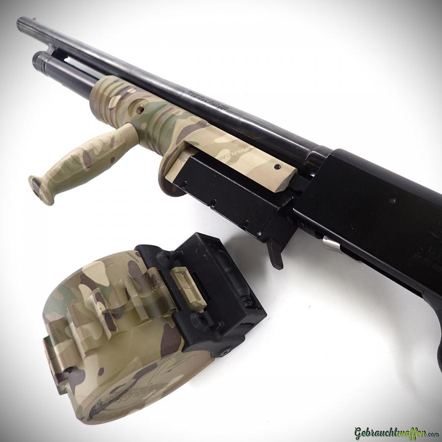 Fusil à pompe Maverick mod. 88, cal. 12/76, customisé, chargeur tubulaire remplacé par un système permettant l'utilisation de chargeurs type camembert, l'action de la pompe restant inchangée, avec poignée type pistolet et crosse télescopique, occasion neuve, jamais tiré, livré avec 2 chargeurs.