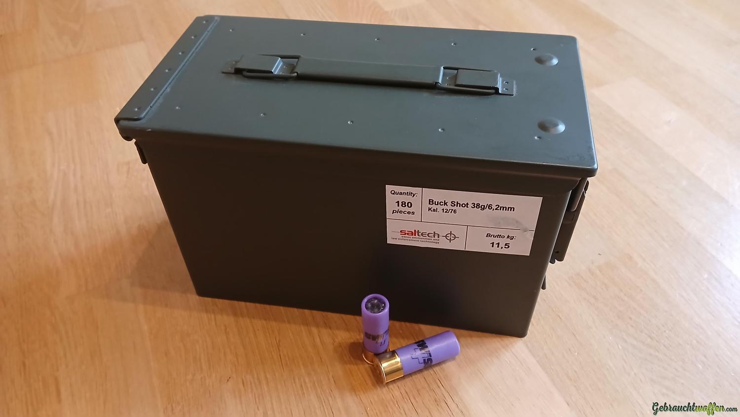 Es kann noch für 300.- eine Kiste mit ca 160 Schuss Buckshot 6.2mm und 50 Schuss Geco Competition Slugs dazu erworben werden.
