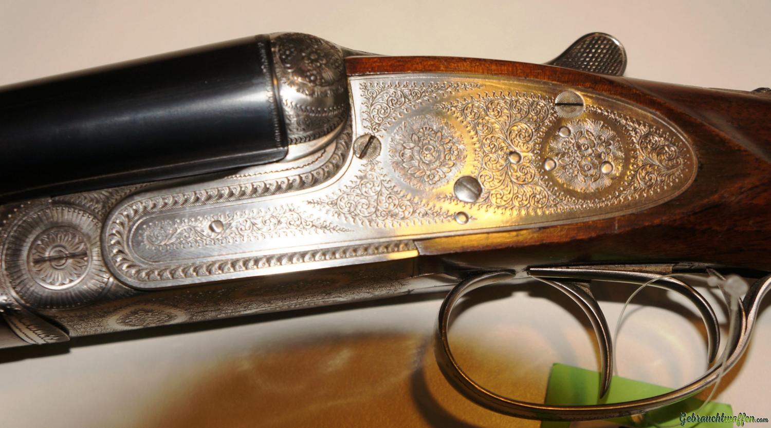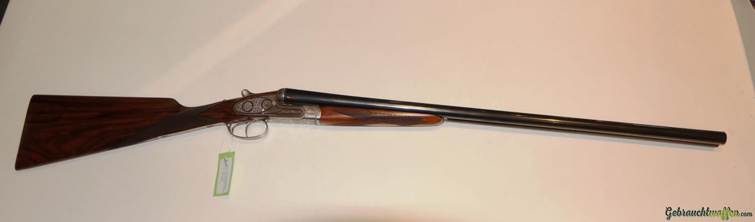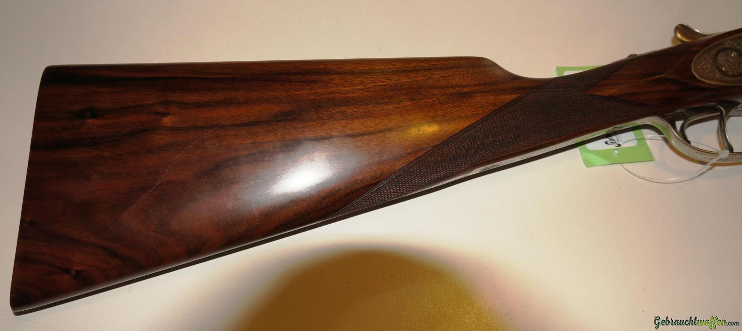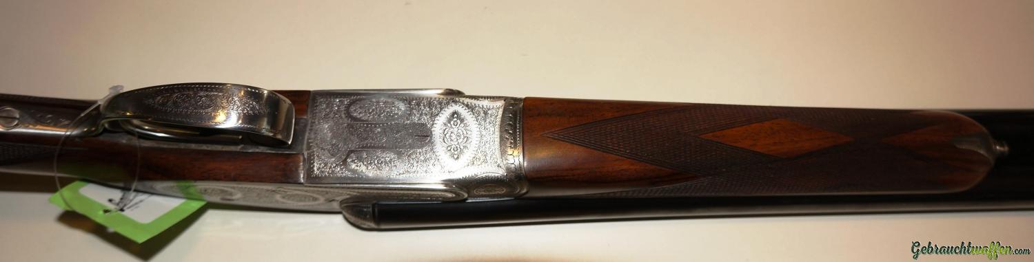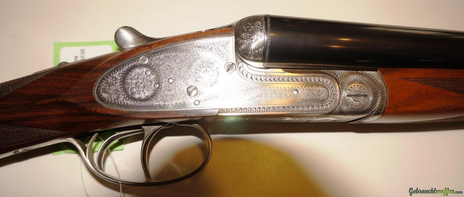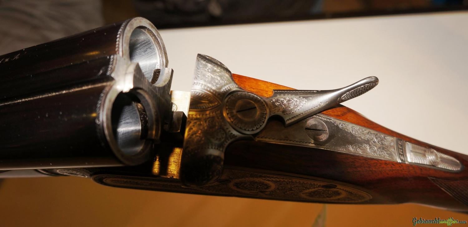 Sie ist eine leichte Flinte mit hervorragender Balance. Original Seitenschloß Handgearbeitete Flinte, Lauflänge 71 cm, selten geschossene Schrankwaffe, in hervorragender Verarbeitung mit Gütesiegel “1Q” für internationale Spitzenqualität, Ejektor, Choke 1/2 – 1/1, Doppelabzug (vorderer mit Rückgelenk), Schiebesicherung auf der Scheibe, seitliche Signale, grau gebeizte Stahlbasküle mit feiner handgestochener vollflächiger Gravur, Ausführung Jagd mit Signatur des Graveurs.