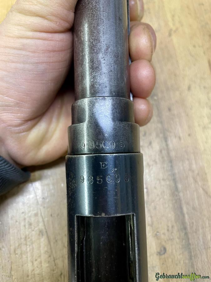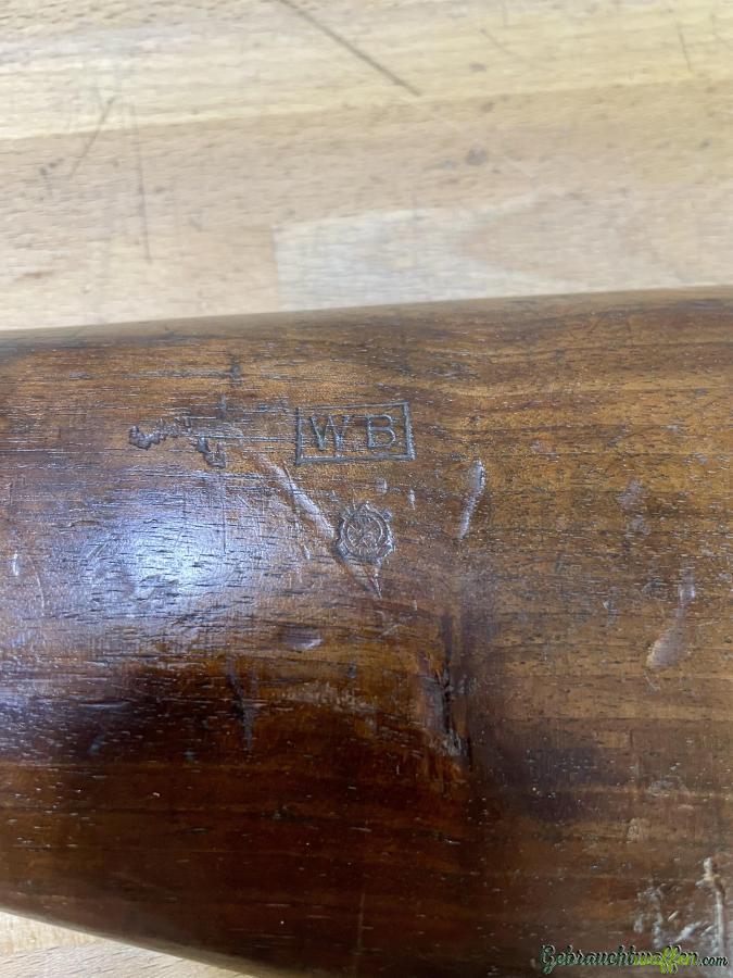 Nussbaumschaft mit kantigem Pistolengriff, Stahlkolbenkappe.