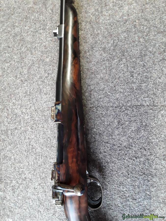 Repetiergewehr in einwandfreiem Zustand, abgeleitet vom System des Alpenjägergewehrs. Lauflänge: 55 cm, mit Gewinde an der Mündung. Nagelabzug, Dreistellungssicherung, die auf den Schlagbolzen wirkt. Sehr gelungene Oberflächenhärtung. Schaft aus gemasertem Nussbaumholz erster Güte.