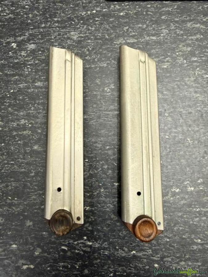 Zu verkaufen sind zwei Magazine, passend zu Schweizer Parabellum-Pistole, Kal. 7.65, mit Holzboden, in sehr gutem Zustand.