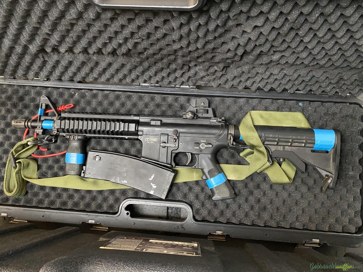 Die Waffen wurden bisher für das CQB Training eingesetzt und wurden in den Jahren 2018/2019 beschafft. Alle Waffen sind funktionsfähig, weissen aber Gebrauchsspuren auf. Das blaue Tape kann entfernt werden, es ist nur für die Identifizierung als Trainingswaffe gedacht.