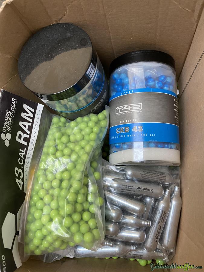 Diverse Menge an CO2 Patronen und Markierungskugeln