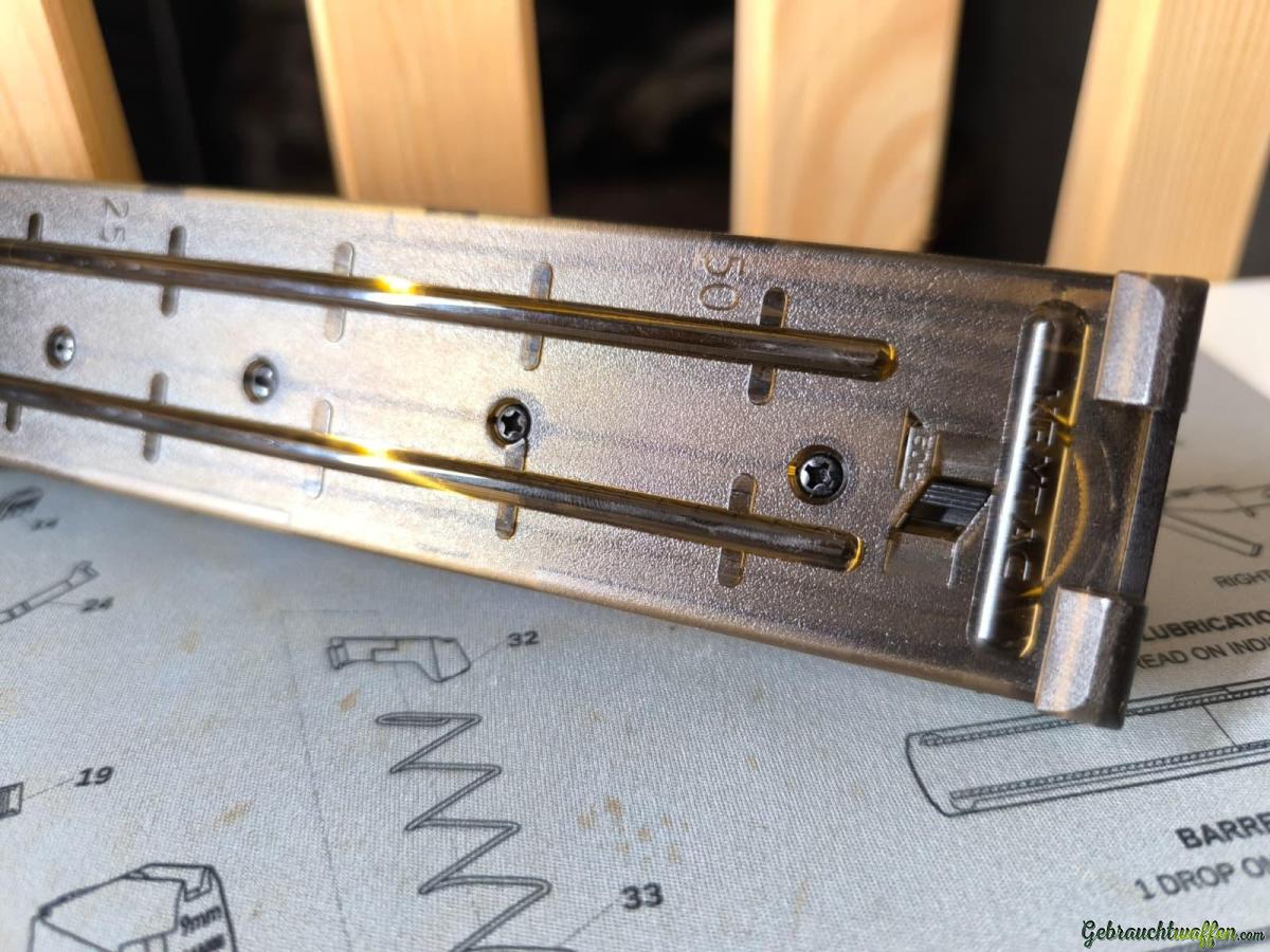 Diese P90 Variante verfügt ab Werk über eine 20mm Schienen für das Anbringen einer Zielhilfe. Die Krytac P90 bietet zudem einen einstellbaren Abzug sowie eine Kapazitätsverstellung von 50 zu 200 Schuss. Auch ein MOSFET sowie T-Type Stecker sind vorhanden.