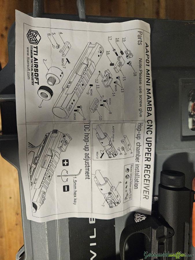 Der Upper wurde komplett mit einem TTi Airsoft Mamba Cnc Upper ersetz. ( der Originale kommt dazu wurde am vorderen teil abgeschliffen, das ein Carbine kit drauf geh) weiter habe ich ein Magwell eine anderen Abzug und Magazinauswurf eingebaut. Das Hopup wurde soweit belassen lediglich ein 50grad Meaple leap gummi und ein tdc addjustment wurde eingebaut. So kann man bequem von oben das hop einstellen.