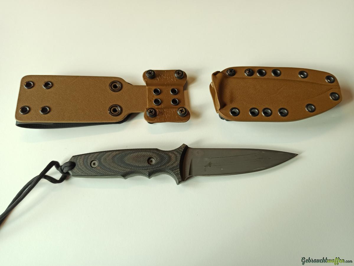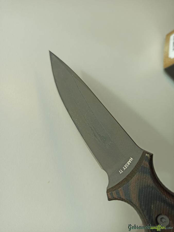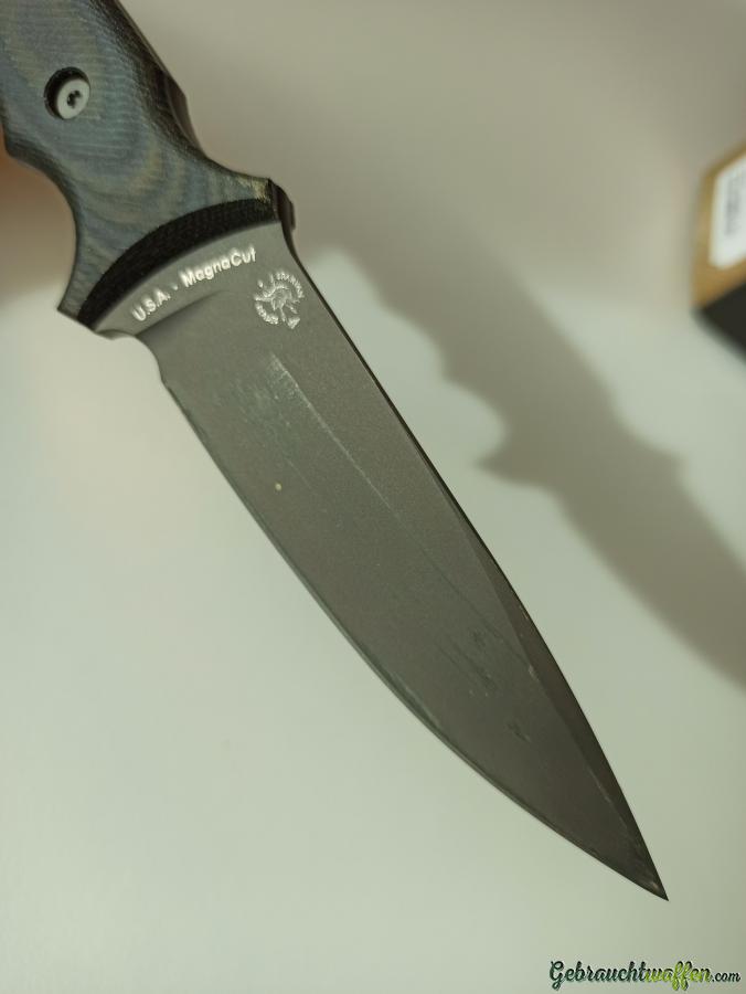 Das Messer hat auf den Klingenseiten Ziehspuren der Kydexscheide, jedoch keine Beschädigung der Beschichtung. Perfekter, spielfreier Sitz in der Scheide. Griffschalen Mircata Camo. Klingenstahl Magnacut. Inkl. sämtlichem Originalzubehör.