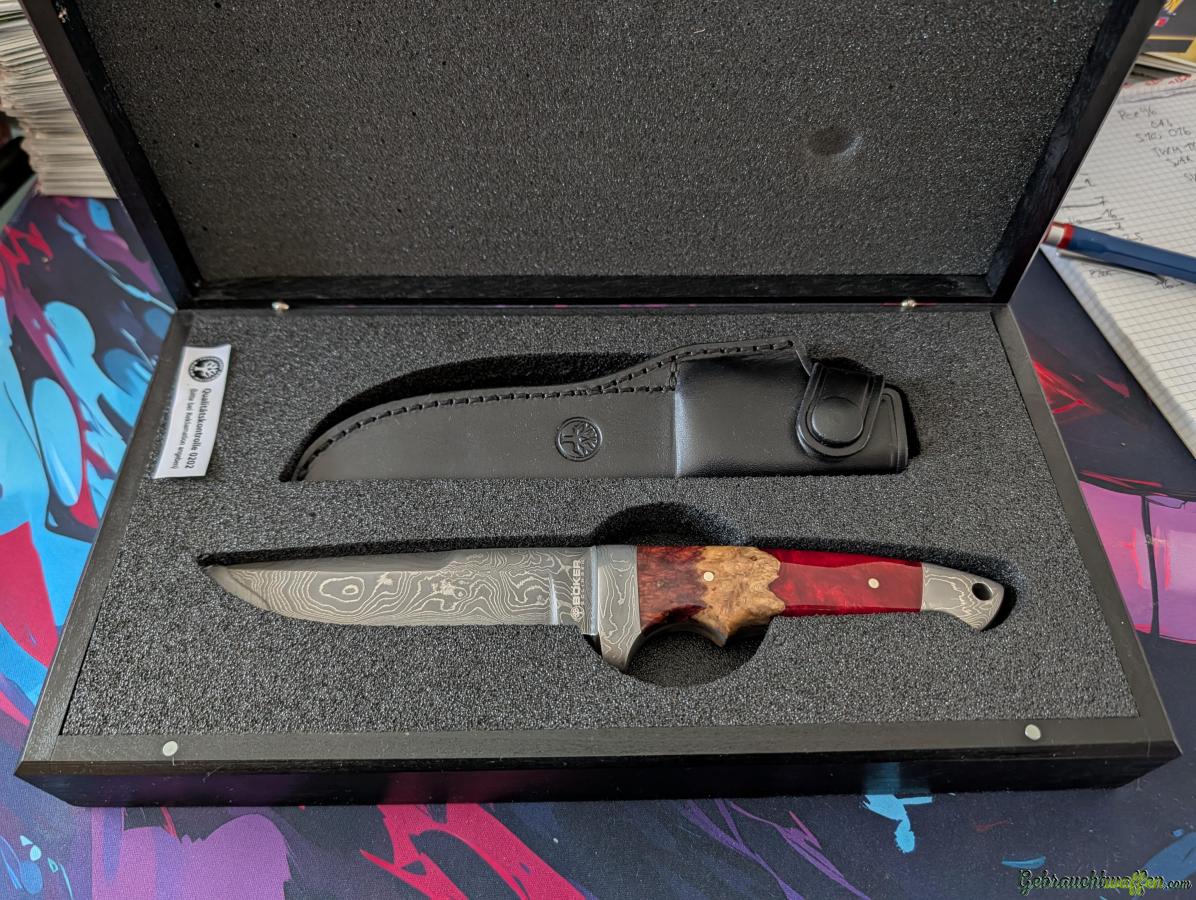 Die Klinge hat noch nie geschnitten und ist mit Werksschliff. Wurde lediglich ausgestellt. Dazu kommt es mit der Originalen Lederscheide und Verpackung.