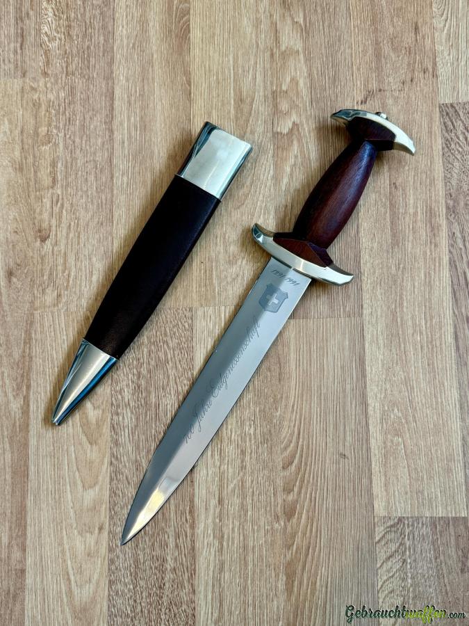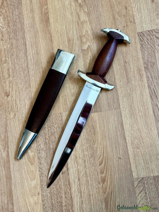 Schweizerdolch, 700 Jahre Eidgenossenschaft KL 245mm, TL 375mm, symmetrisch geschliffene Klinge, geölter Nussholzgriff, Parierstange und Knauf versilbert. Flache Gratklinge mit Ätzung: Schweizerkreuz im Wappenschild, "700 Jahre Eidgenossenschaft, 1291-1991" und auf der Gegenseite "Nr. 028 von 700". Lederne Scheide, Garnitur versilbert. Nummer #028 von 700.