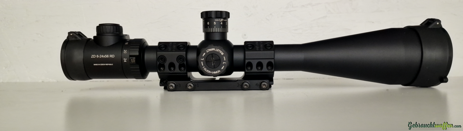 Das ZD 6-24×56 RD ist das Zielfernrohr für den anspruchsvollen Präzisionsschützen. Es ist mit dem beleuchteten Mil Dot 2 Absehen ausgestattet, das mit Markierungen für die Kaliber 7.62x51mm Nato und .338 LM ausgestattet ist. Über den dritten Turm wird die Parallaxe von 25m bis unendlich eingestellt. Mit der neuen Smart Absehenbeleuchtung von Meopta wird die Helligkeit des Absehens an die Tag/Nacht Umgebungshelligkeit angepasst. Die Absehenschnellverstellung mit ¼ MOA Klicks = 0.7mm auf 100m/Klick und einem Verstellbereich von 80 MOA = 233cm auf 100m und das Gehäuse aus hochfester Aluminiumlegierung mit 30mm Mittelrohrdurchmesser sind weiter Merkmale dieses Zielfernrohrs.