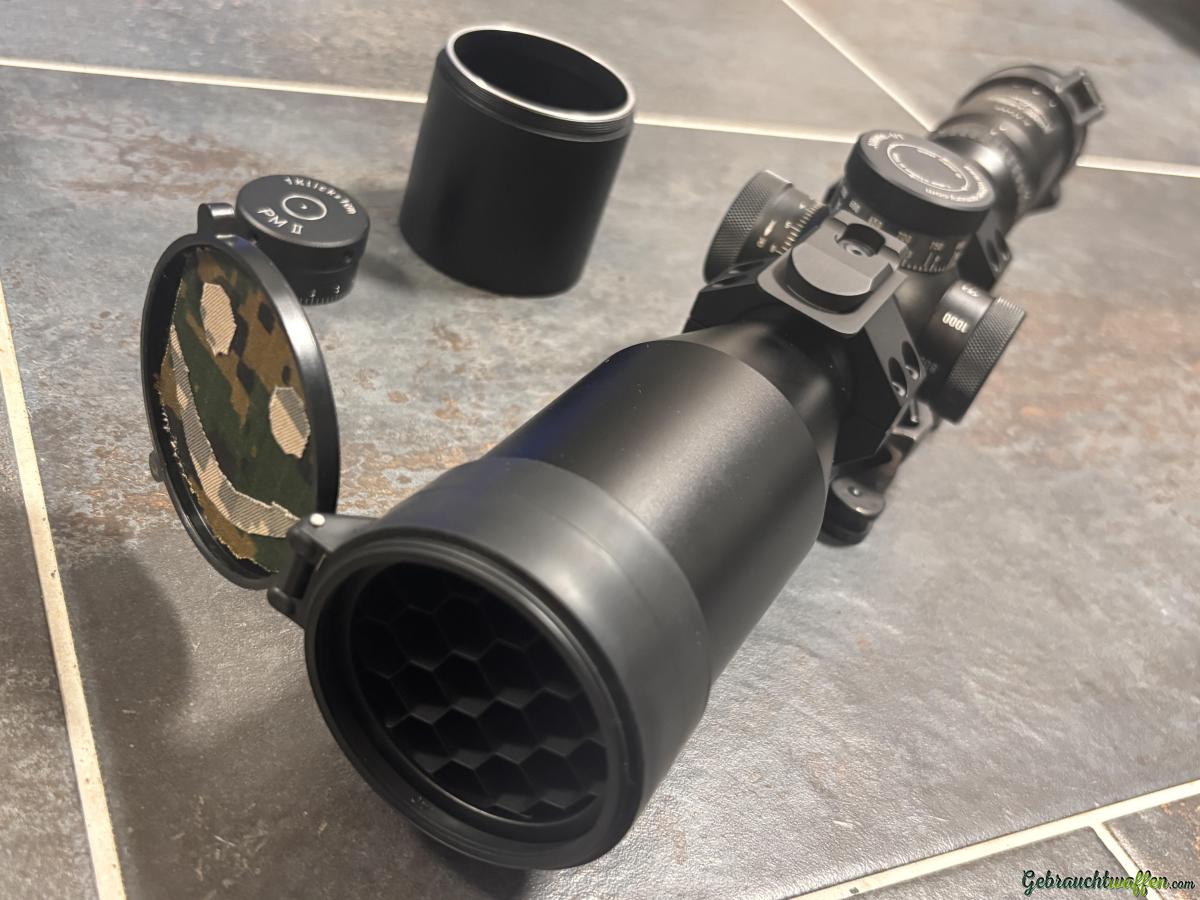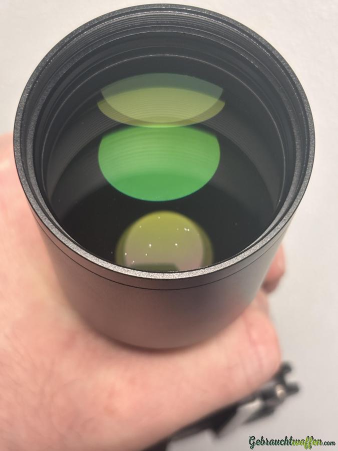 ZF habe ich bereits gebraucht gekauft, Blockmontage war neu. Montagespuren auf dem Mittelrohr, die Linsen sind Kratzerfrei (kleinste Pünktchen auf den Linsen bei Schrägdurchblick ersichtlich, Durchsicht ist aber klar und keine Auffälligkeiten auf dem Bild feststellbar), keine OVP vorhanden, mit Sonnenblende, zusätzlichem Verstellturm (montiert), Butler Creek-Kappen und Wabenfilter. Verstellung 1cm/100m.