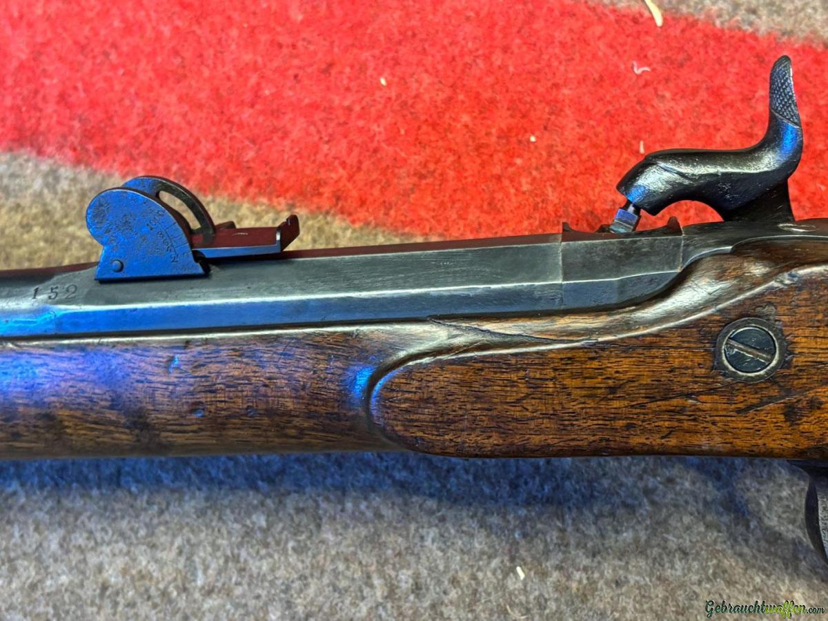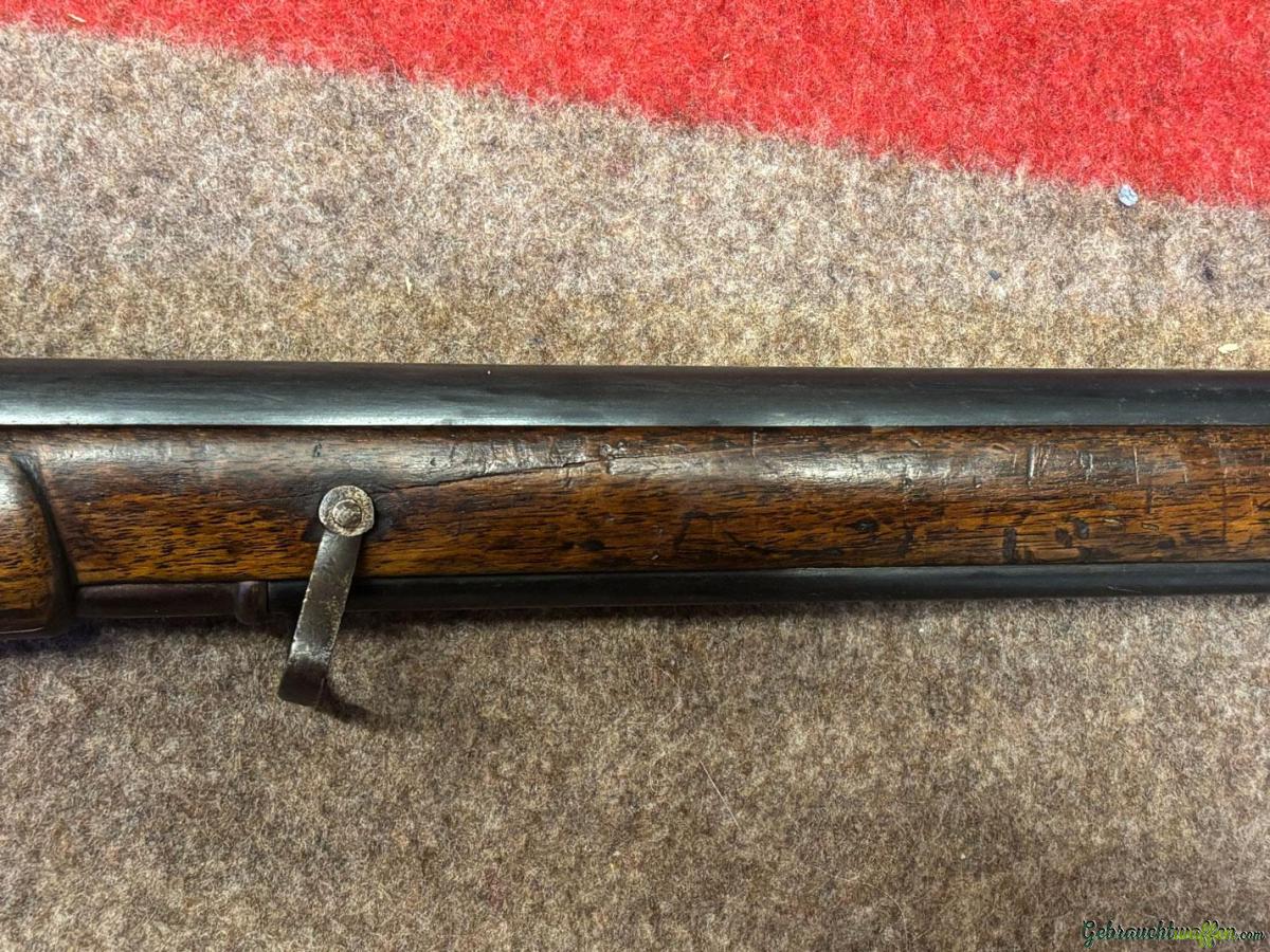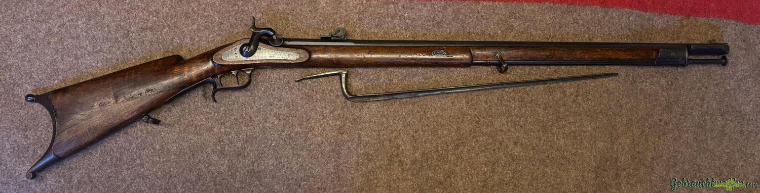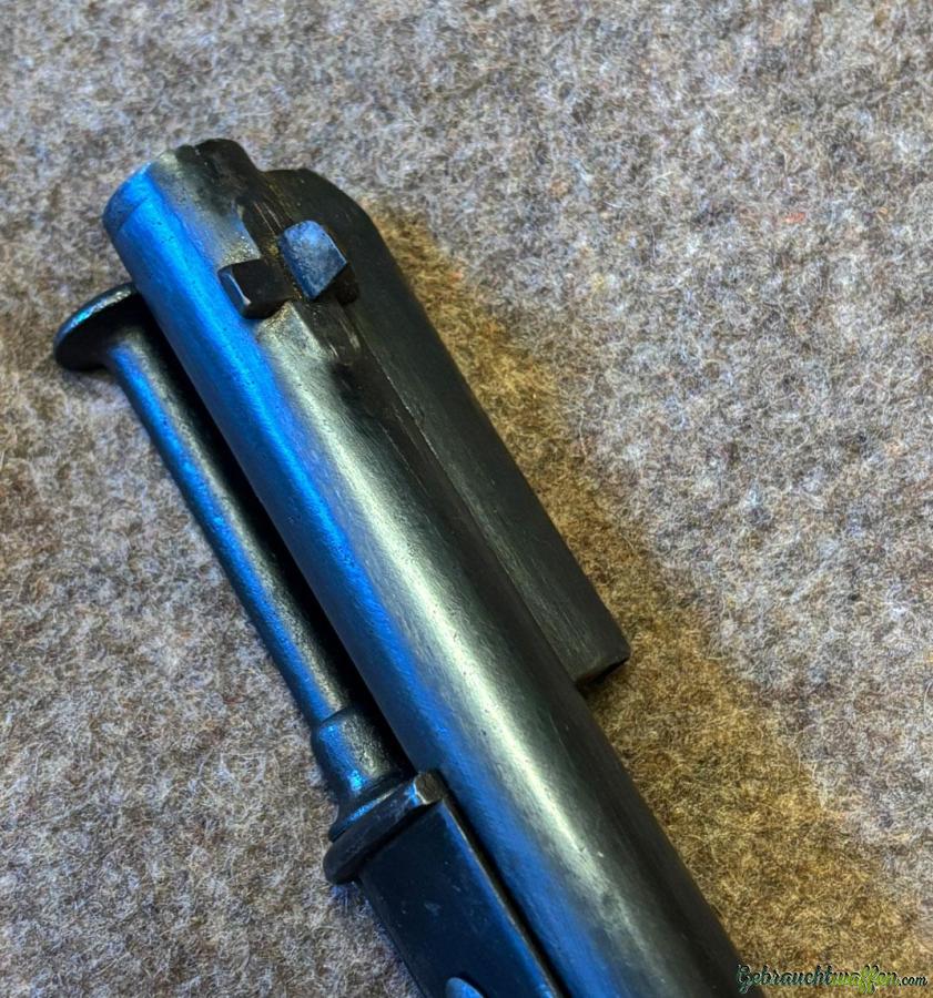 Gewehr eher für Schützen als für Sammler, da es zahlreiche Reparaturen erfahren hat und in der Vergangenheit sicherlich neu brüniert wurde. Die Reparatur am Kolbenfuss scheint eine Zeughaus-Reparatur zu sein, auf jeden Fall ist alles absolut fest. Bajonett in gutem Zustand ohne Nummer.