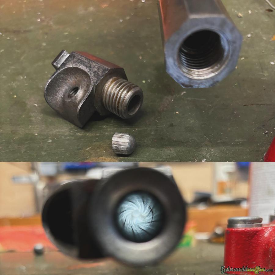 Der Piston und das Korn sind neue Teile. Das Korn ist für das Schiessen auf 50 m eingestellt. Der Lauf ist nicht spiegelblank,hat aber noch gute Züge auf (Foto). Die Laufschraube lässt sich mit den richtigen Werkzeugen abschrauben. Praktisch für die Reinigung.