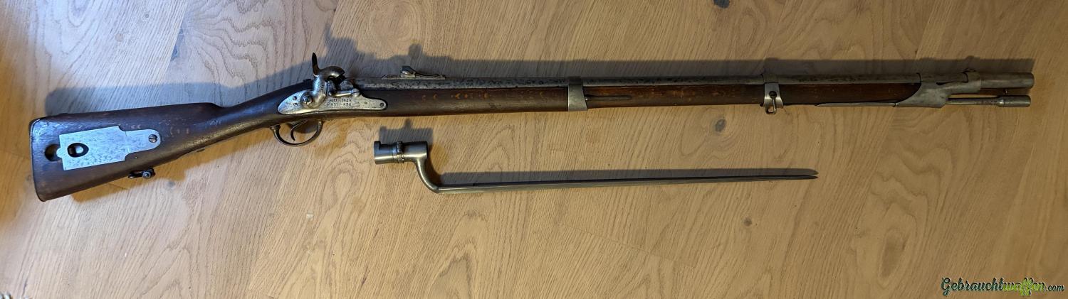 Super seltenes schwedisches Militär-Perkussionsstutzer, das von Jägertruppen benutzt wurde. Der Lauf hat noch den Dorn, auf den die Kugel aufgesetzt wird (System Thouvenin). Komplett mit Bajonett und einer Giesskokille für die richtige Tamisier-Geschoss. Mechanisch in super Zustand.