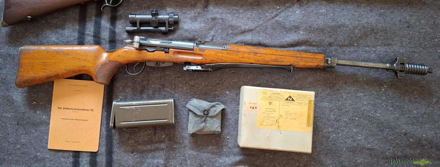 - ZFK 55 Kal. 7,5, Nummerngleich. Inklusive Original-Kartonbox aus dem Arsenal, Metallbox für Optik, Anleitung für Waffenmechaniker und Reinigungsset. CHF 3.250,- RESERVIERT