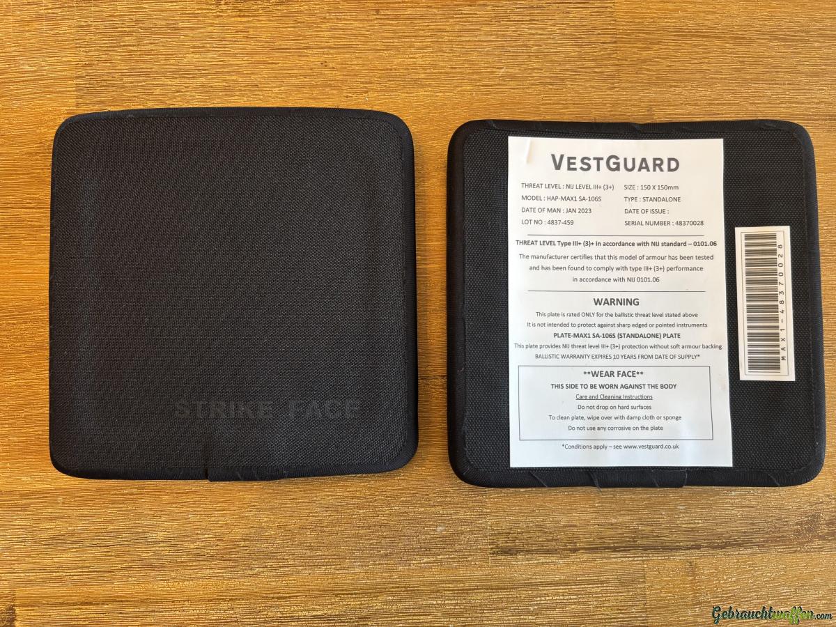 Weiter wird der Plattenträger mit zwei neuwertigen (ungetragen und unbenutzt) Level III+ hartballistischen Seitenplatten der Firma VestGuard aus England geliefert (für den Schutz der Flanken). Auch diese hochwertigen Platten wurden in Europa hergestellt, sowie durch offizielle Beschussämter getestet und erfüllen die Schutzklasse NIJ Level III+ (Level 3+), stand alone (benötigen keine zusätzliche Weichballistik um die Schutzwirkung zu erfüllen).
