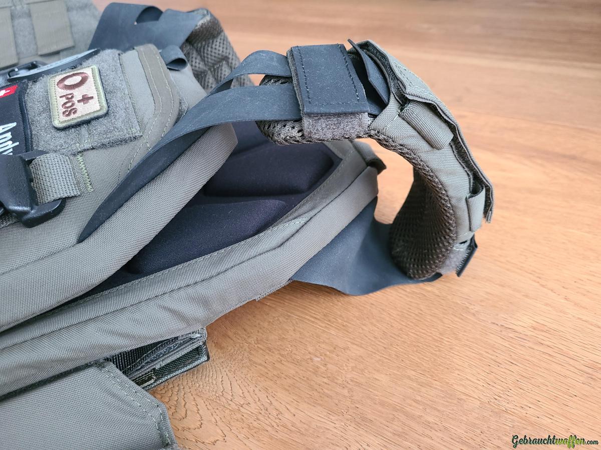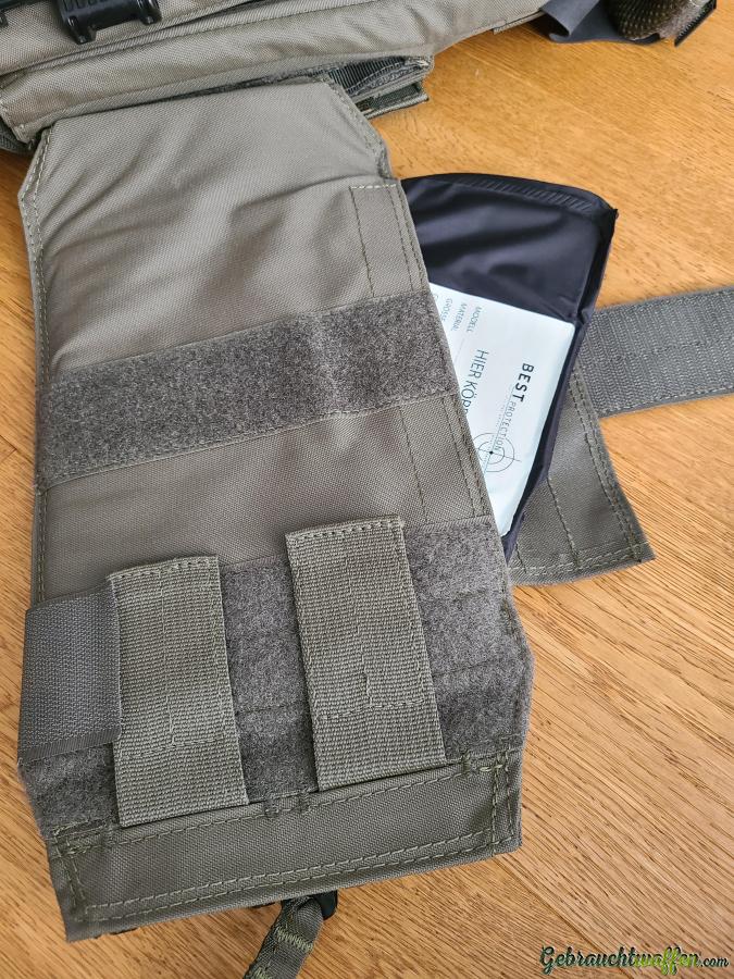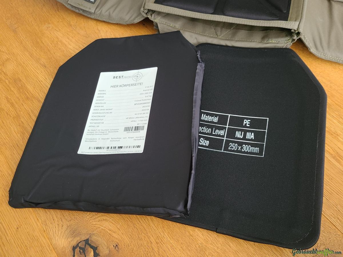 Brust und Rücken hat eine starre Platte mit Schutz 3a und Zusätzlich Weichbalistick mit nochmals 3a Schutz. Seitenteile haben nur Weichbalistick Einsätze mit 3a Schutz. Vorderer unterer Verlängerung hat einen Stahl Einsatz und einen Weichbalistick Einsatz mit 3a Schutz.