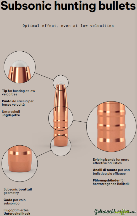 Silentio-Geschosse sind für den subsonischen Einsatz optimiert und entfalten ihre Wirkung zuverlässig auch bei sehr niedrigen Geschwindigkeiten.