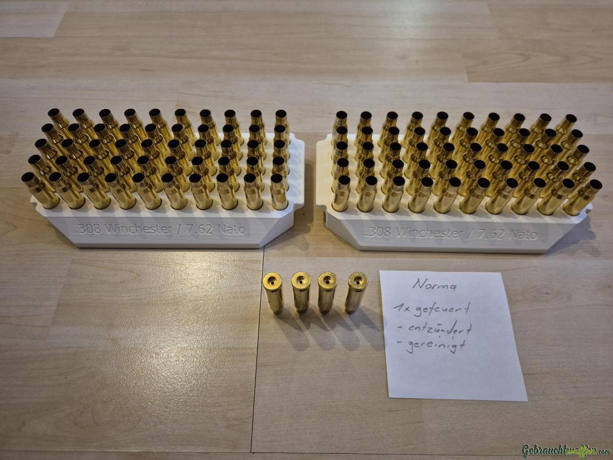 Hiermit stehen 104 stk 308 Win Norma-Hülsen zum Verkauf. Die Hülsen stammen aus Norma Golden Target Fabrikmunition vom gleichen Batch, wurden nur 1 Mal abgefeuert (Tikka T3X), sind entzündert und gereinigt. Die Norma Hülsen gehören zu den hochwertigsten Hülsen fürs Wiederladen.