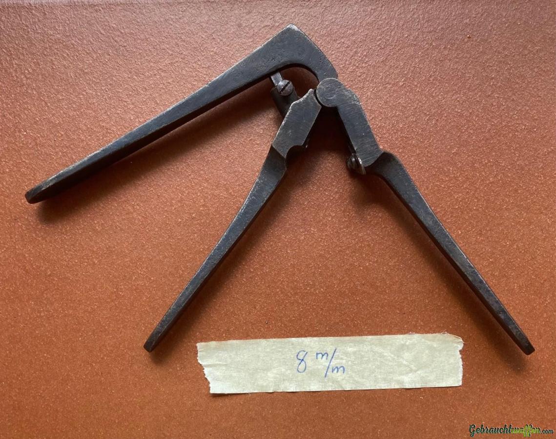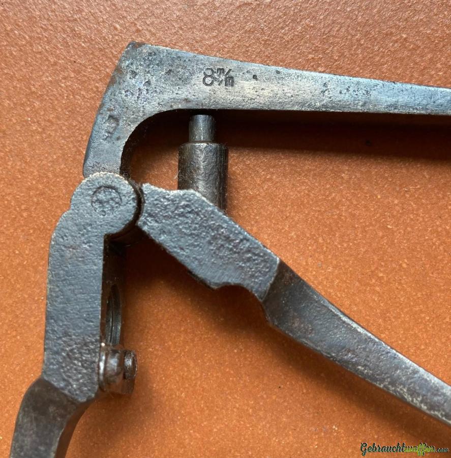 Zündhütchenzangen gehörten zu den Wiederladegeräten. Die meisten Schützen luden (schon aus Kostengründen) ihre Patronen selbst. Wegen des geringen Gebrauchsdrucks der Patrone musste die Hülse nicht kalibriert werden. Es reichte, mit der Zündhütchenzange das abgeschossene Zündhütchen zu entfernen, ein neues Zündhütchen zu setzen, die fertig abgewogene Pulverladung einzufüllen und das Geschoss entweder von Hand oder mit einem einfachen Geschosssetzer in den Hülsenmund zu schieben. Diese Zündhütchenzange wurde für Jagdgewehrladungen benutzt. Sie besteht aus Eisen und besitzt außer den beiden Zangenarmen noch einen mittig angebrachten Hebel. Dieser hatte die Aufgabe, den mittels einer Metallfeder am Zangenarm befestigten Dorn durch eine entsprechende Bohrung der Zangenbacken zu drücken und somit das benutzte Zündhütchen zu entfernen. Die Bohrung gegenüber entspricht den Patronenhülsen vom Kaliber 8 m/m, wie man der auf dem Hebel eingestanzten Nummer entnehmen kann. Ein vor diesem Loch angebrachter Riegel hielt die Hülse so lange fest, bis das Zündhütchen eingesetzt oder herausgezogen worden war.